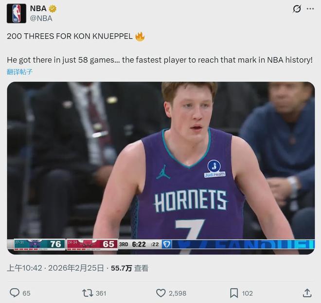 更重要的是,克尼佩尔打破了一项NBA历史纪录:仅用58场比赛,投进生涯200记三分,成为NBA最快达成的球员。此前纪录是邓肯-罗宾逊的69场,克尼佩尔把纪录提升了一大截。此外,克尼佩尔本赛季命中201记三分,联盟第一!